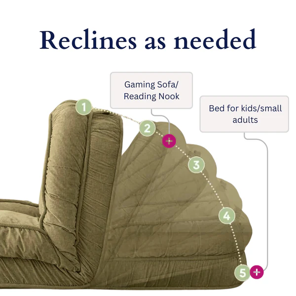Convertible Functionality: Adjusts from an inviting chair to a full single bed. providing versatility for lounging. reading. or sleeping.